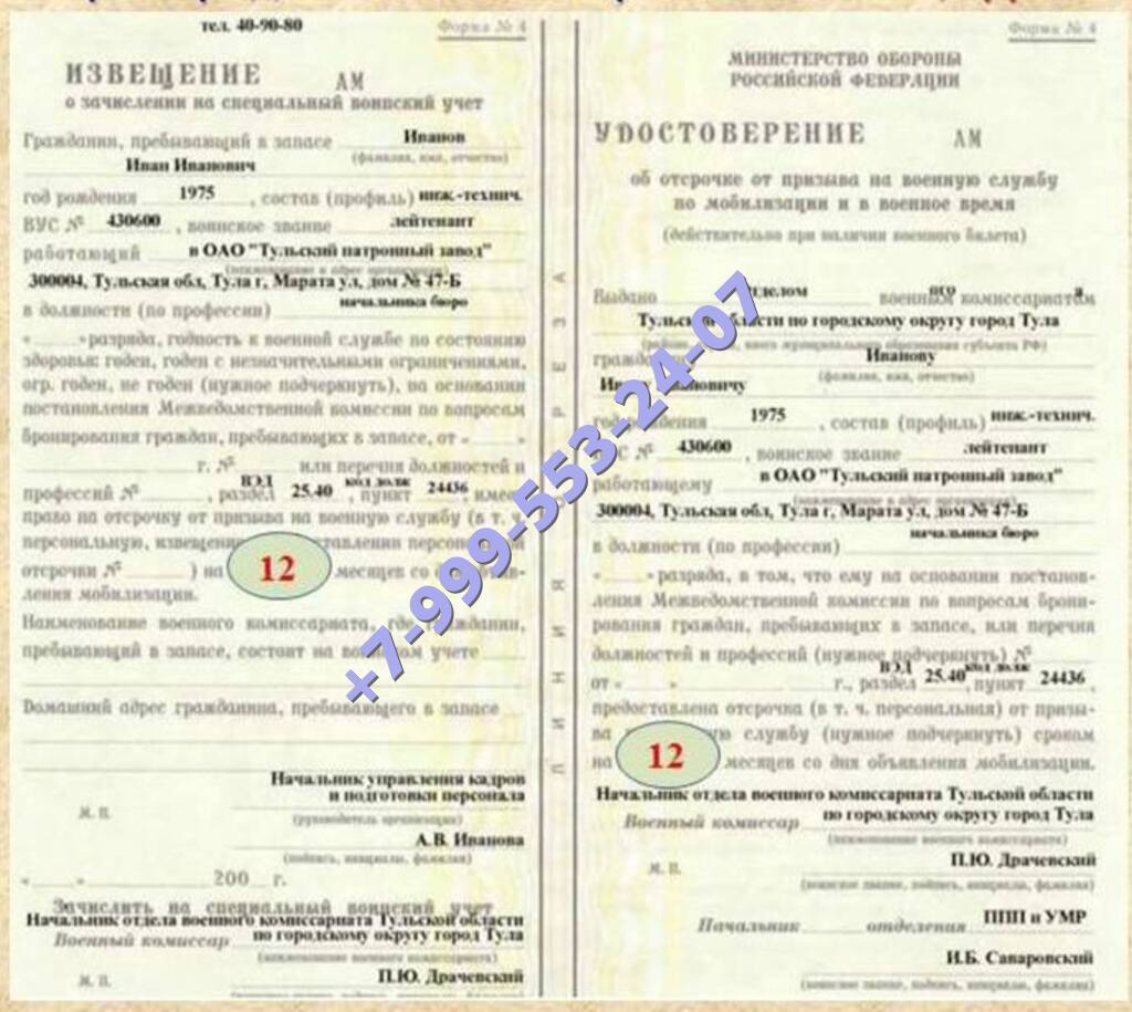 Наша компания предлагает купить в Киренске удостоверение об отсрочке на военную службу на максимально выгодных условиях для клиента. Документы легальные, использованы бланки государственного образца.